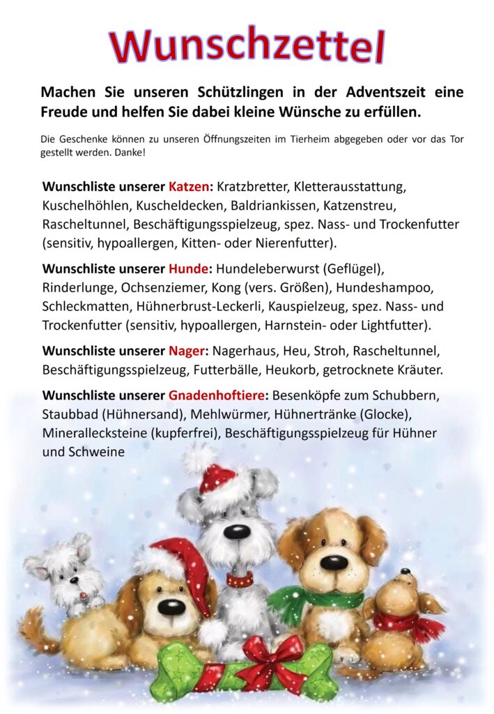 Machen Sie unseren Schützlingen in der Adventszeit eine Freude und helfen Sie dabei Wünsche zu erfüllen.