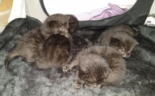 Es handelt sich um eine Mutterkatze mit vier noch sehr jungen Kitten (alle schwarz), sowie drei weitere Kitten im Alter von ca. 5-6 Wochen (schwarz-weiß). Alle sind sehr zutraulich und müssten bis vor kurzem noch bei Menschen gelebt haben.