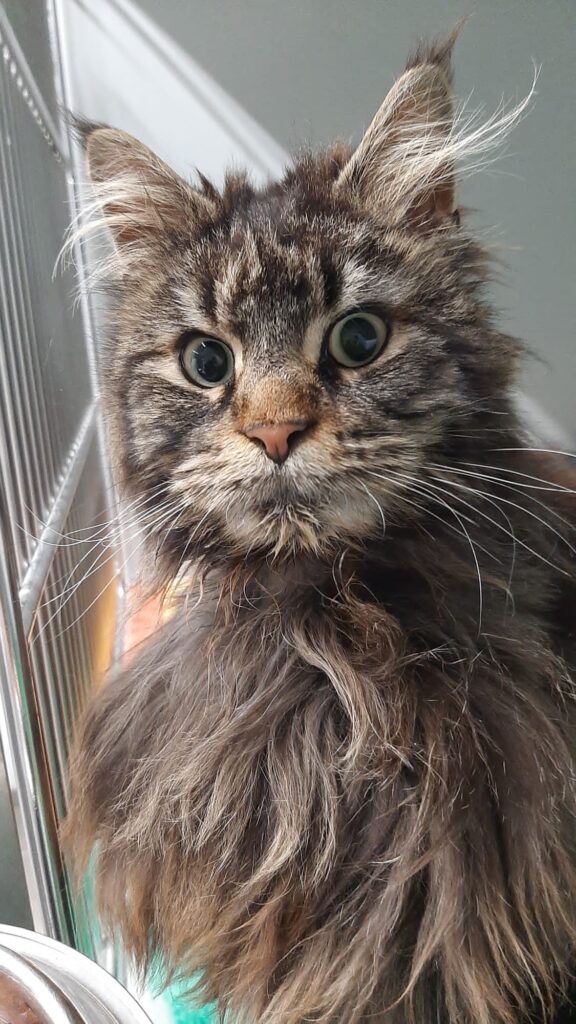Diese zutrauliche und abgemagert Katze, weiblich und ohne Kennzeichnung, wurde uns aus Rettershain gebracht. Ihr Fell bestand fast ausschließlich aus dicken Filzplatten, sie hat teils kahle Stellen sowie mehrere Blutkrusten und einen eitrigen Ausfluss. Wer kann uns Hinweise zu den Besitzern geben?